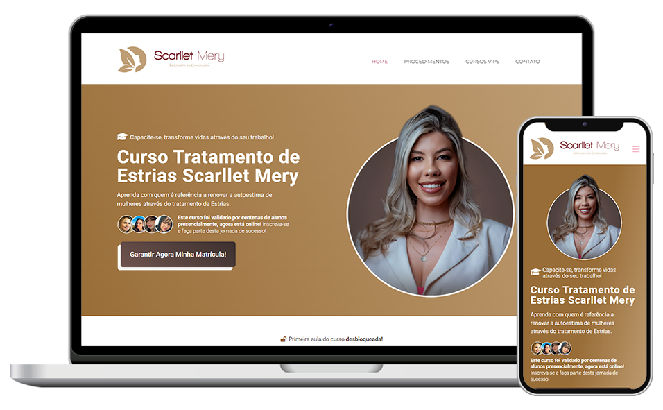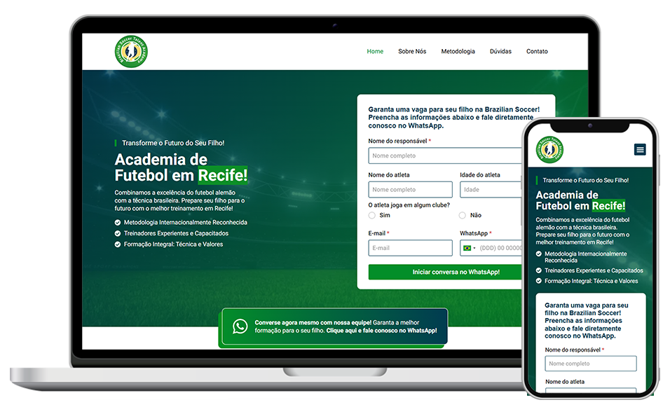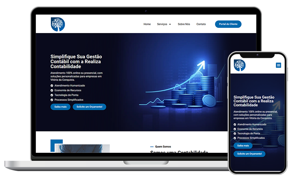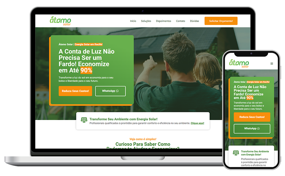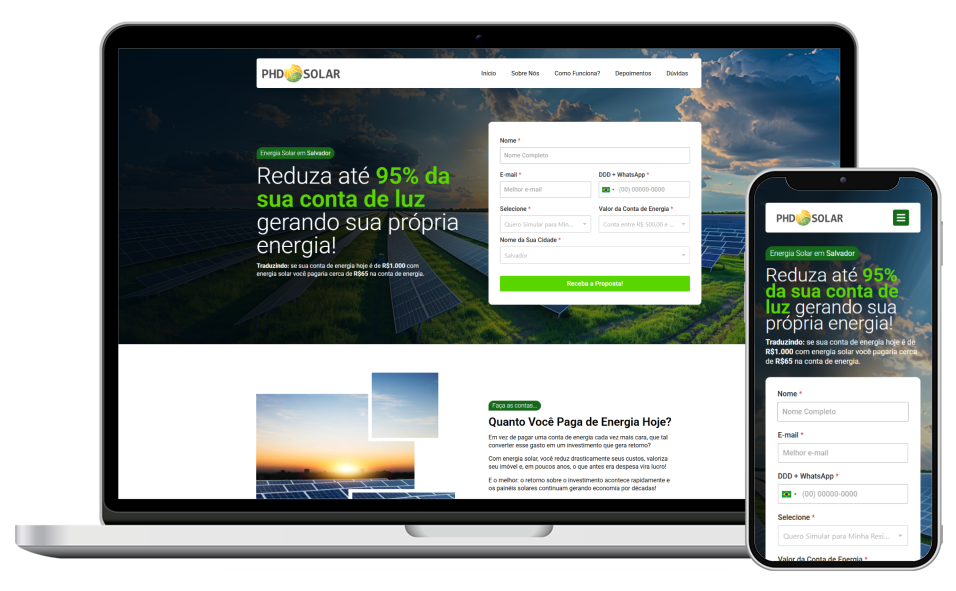 Seu site será responsivo, se adaptando perfeitamente ao celular, tablet e computador. Visual bonito, navegação fluida e performance em qualquer dispositivo.