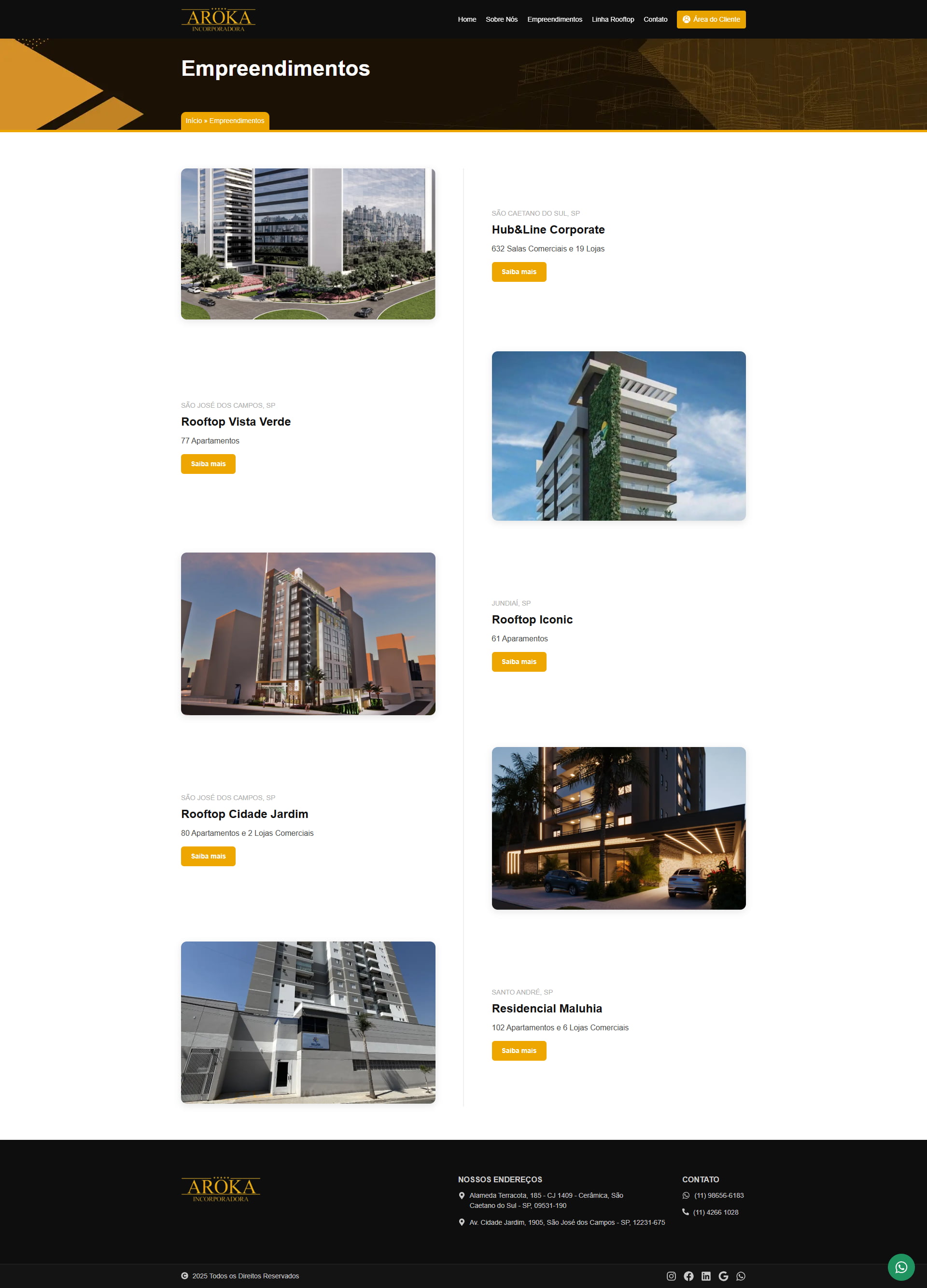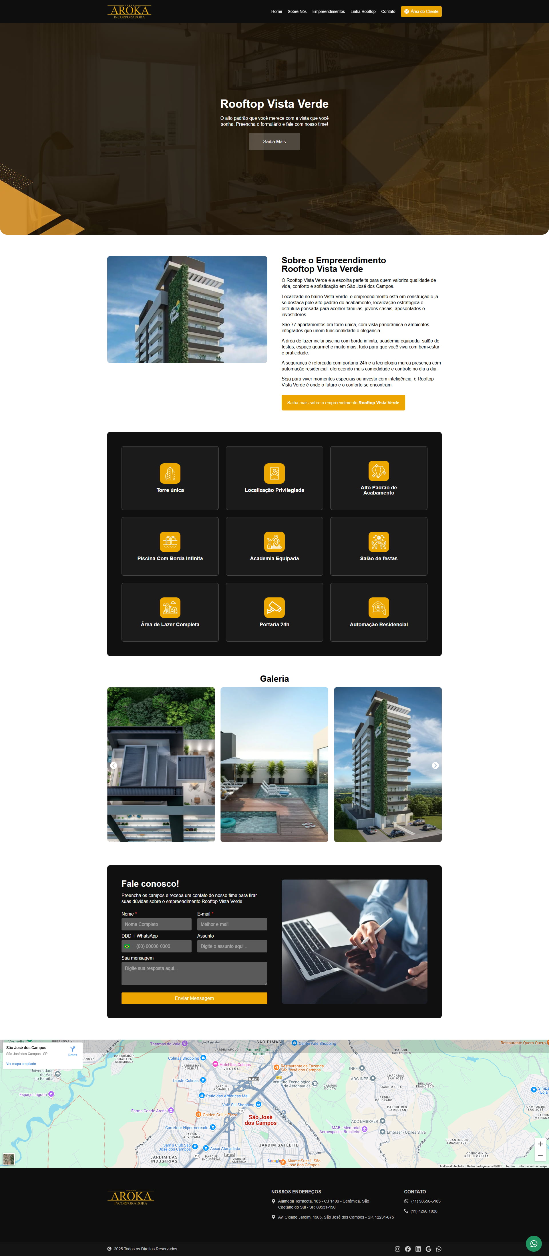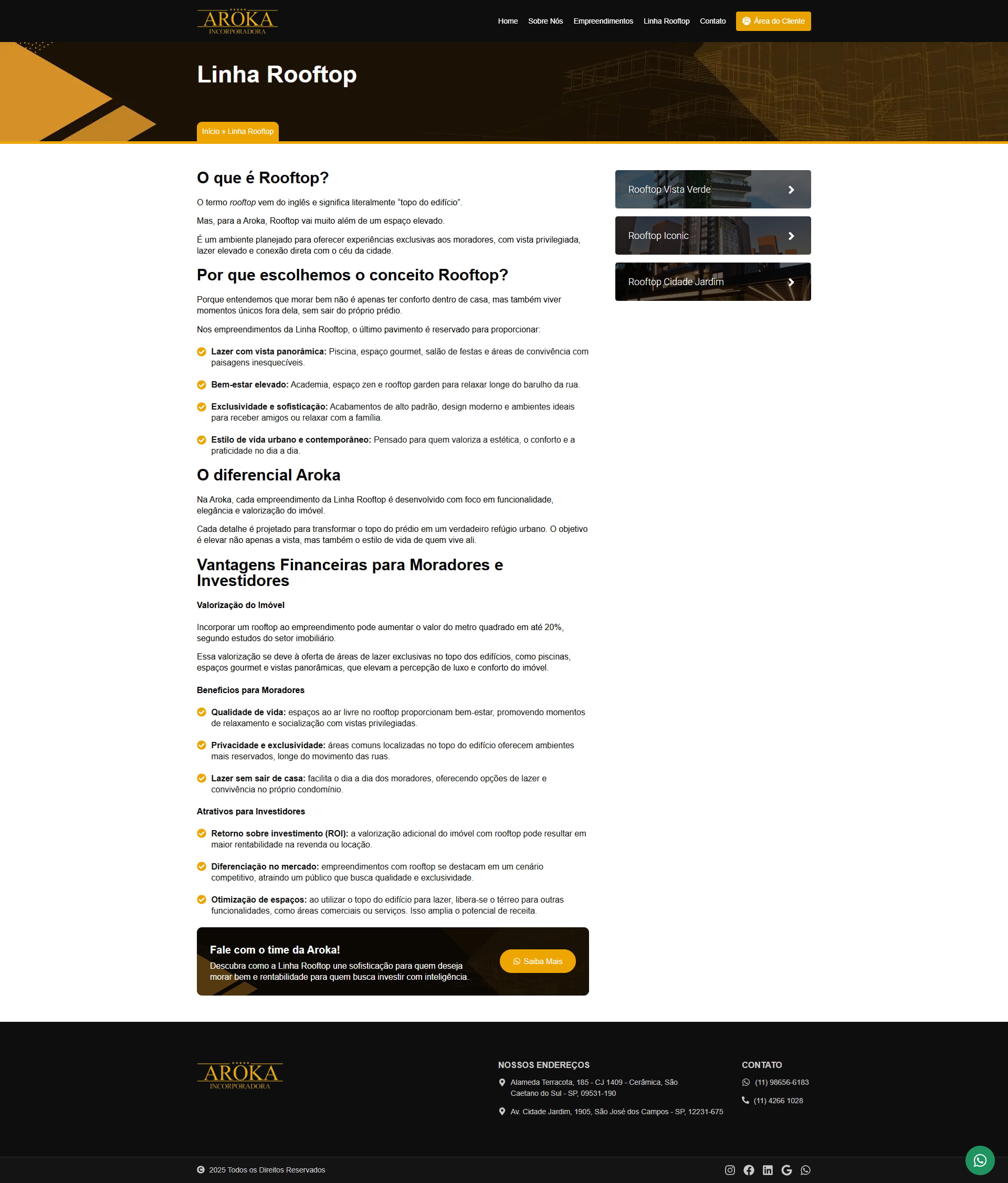 O projeto é do tipo Multipage, com páginas institucionais, uma seção dedicada à linha Rooftop, formulário de contato e uma página individual para cada empreendimento.