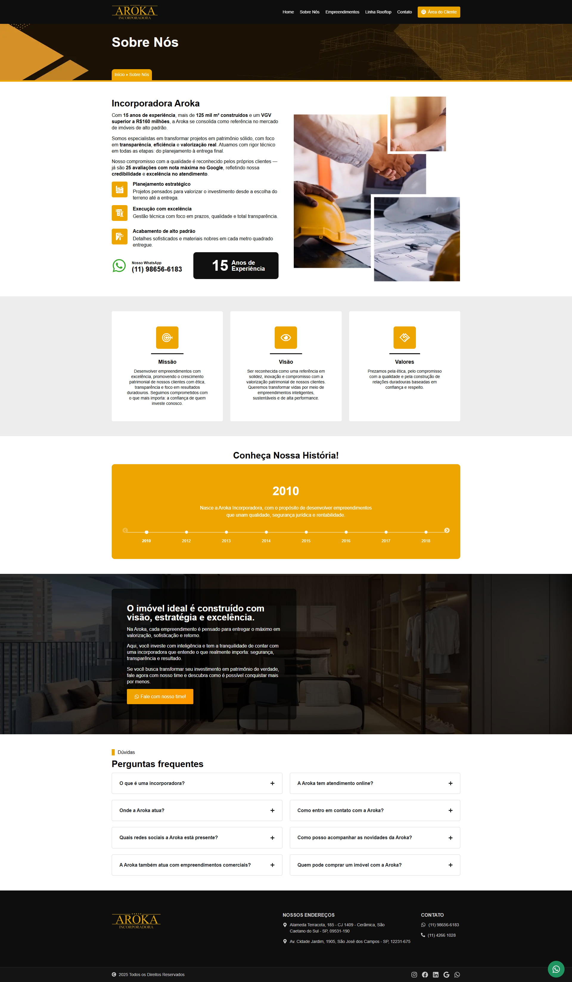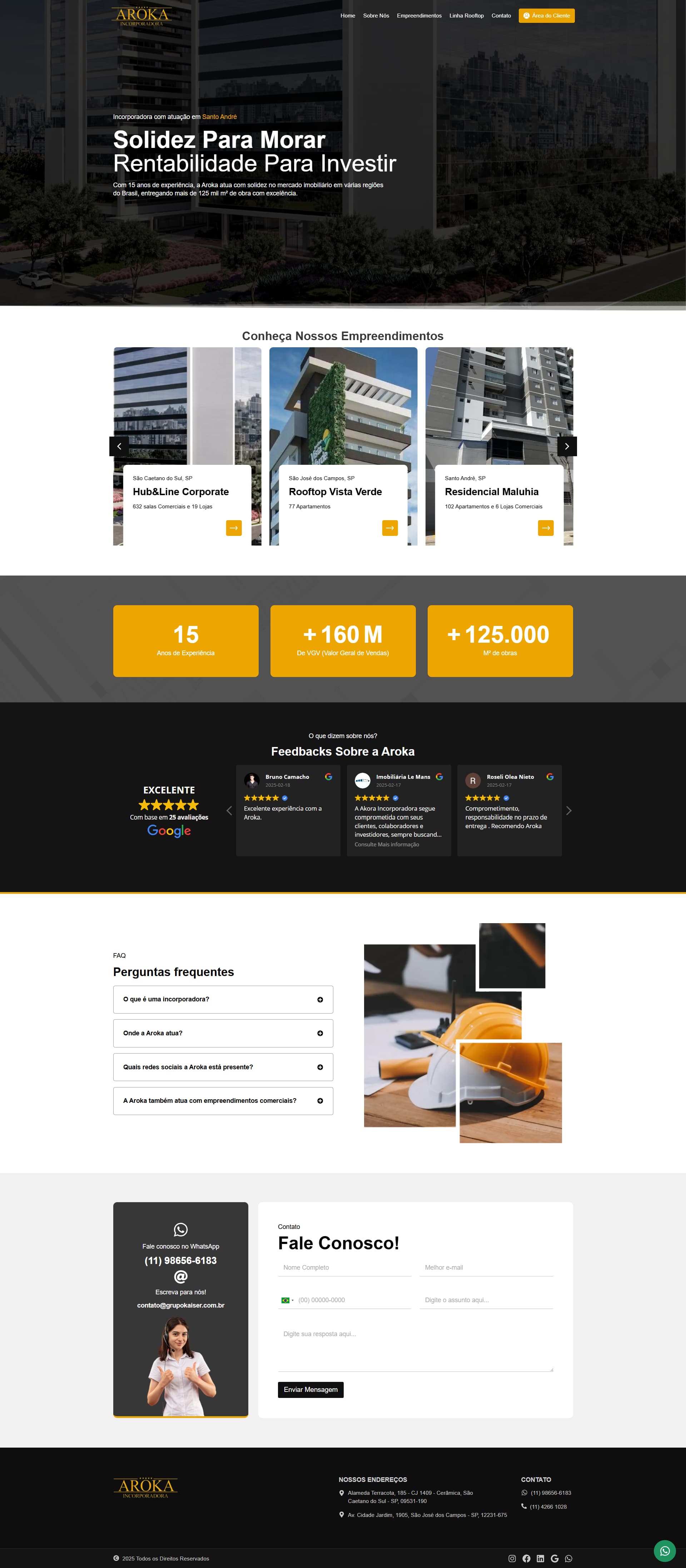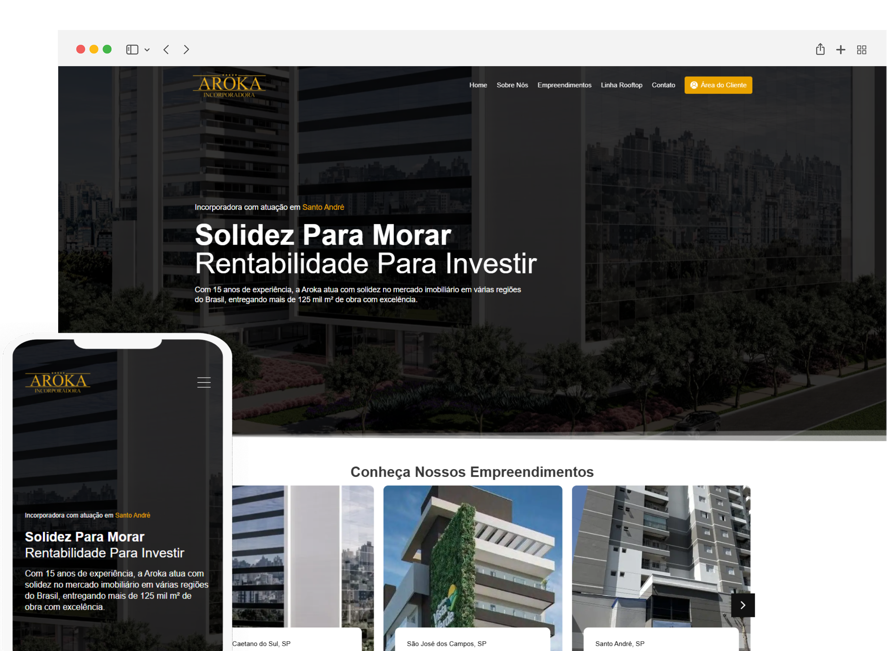 Com mais de 15 anos de experiência, a Aroka se destaca no mercado de imóveis de alto padrão, com mais de 125 mil m² construídos e um VGV superior a R$160 milhões.