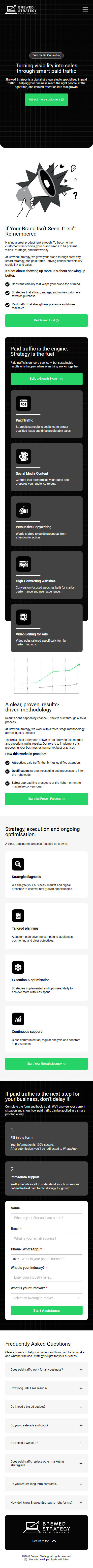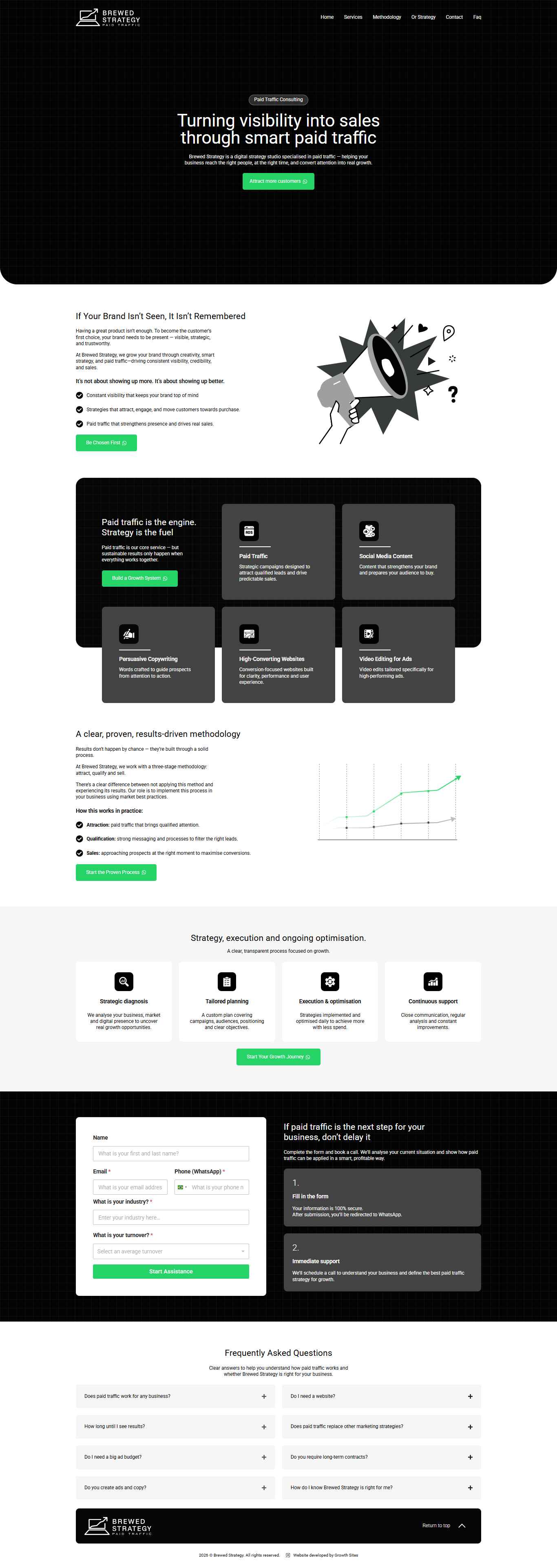 O site da Brewed Strategy foi desenvolvido em 2026 pela Growth Sites, utilizando principalmente WordPress e Elementor.