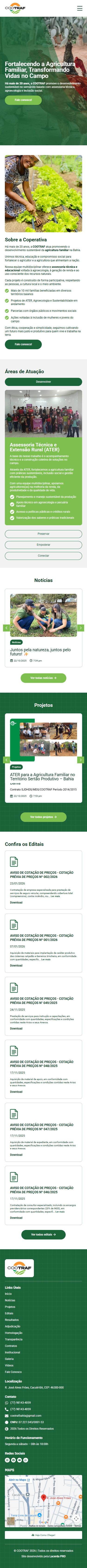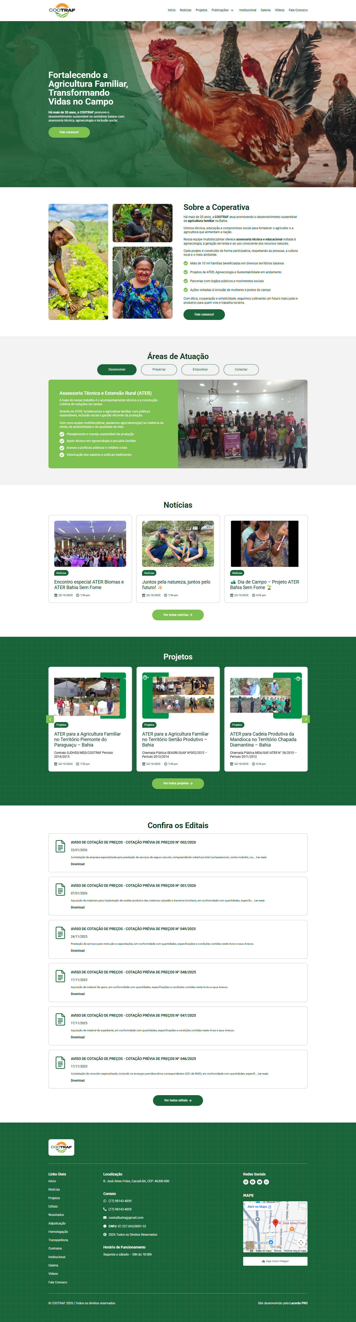 O projeto é um site institucional, estruturado com múltiplas páginas para apresentar a atuação da cooperativa, seus projetos e sua missão de fortalecer a agricultura familiar no semiárido baiano.
