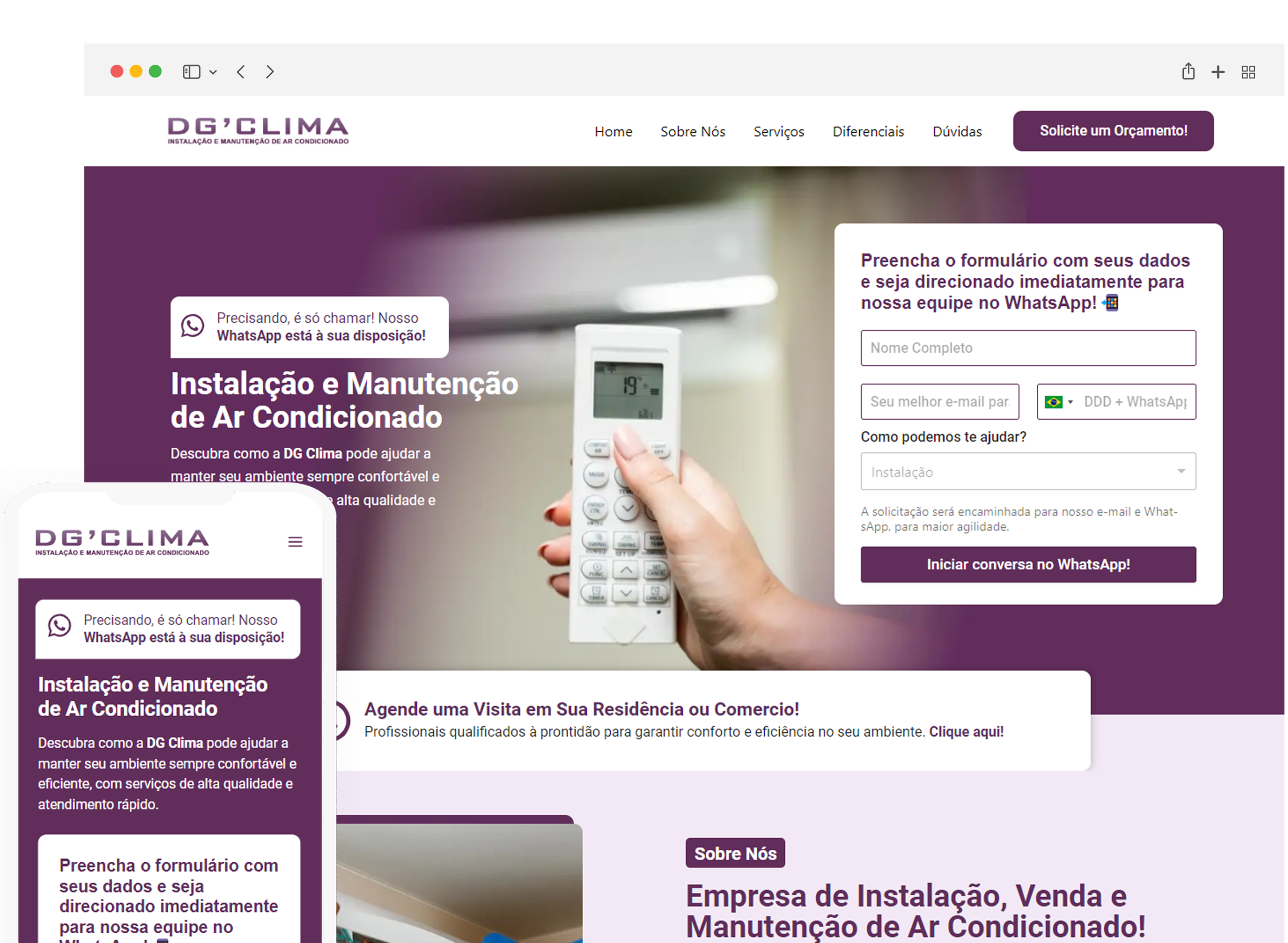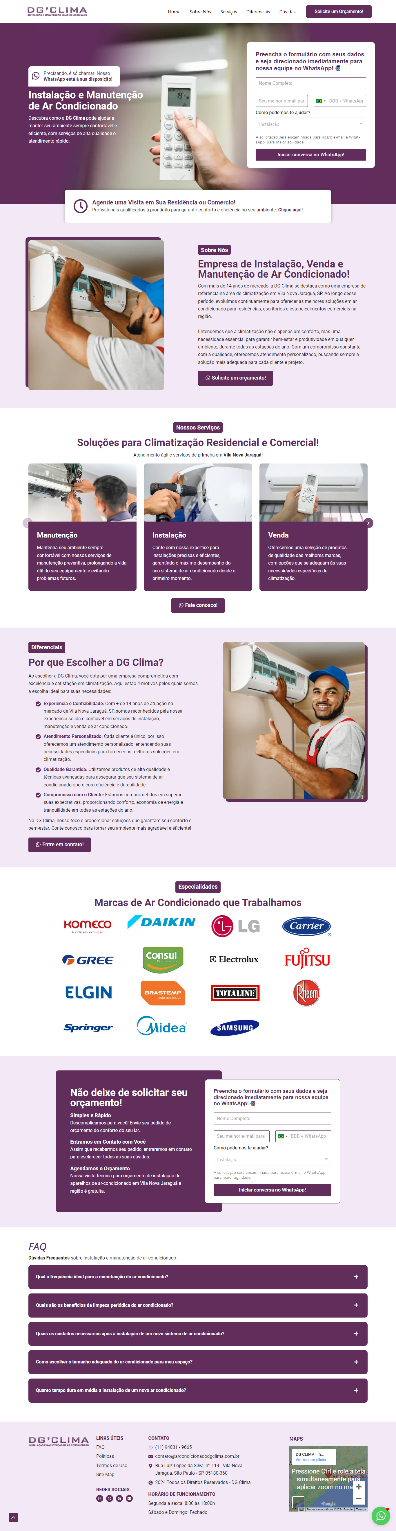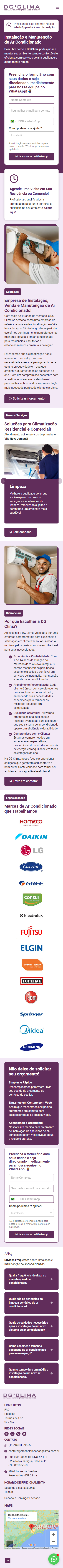 O site da DG Clima, desenvolvido em 2024 pela Lacerda PRO, é um projeto One Page criado com WordPress e Elementor. Localizada em Vila Nova Jaraguá, São Paulo, a DG Clima se especializa em instalação e manutenção de ar-condicionados.