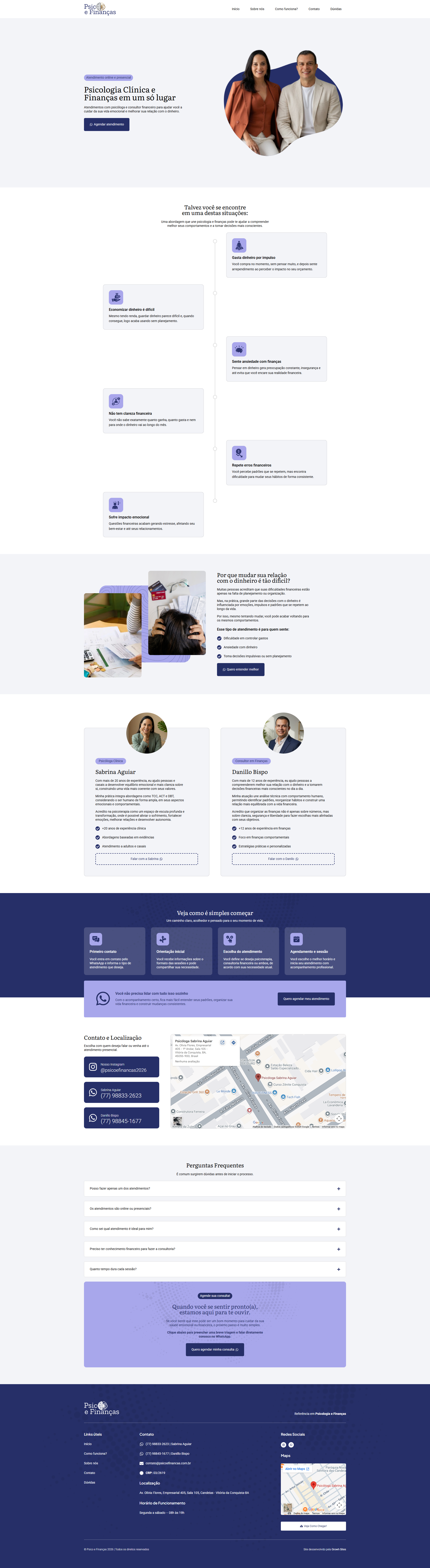 O projeto reúne em uma única página o atendimento online e presencial oferecido pela psicóloga Sabrina Aguiar (+20 anos de experiência com TCC, ACT e DBT) e pelo consultor financeiro Danillo Bispo (+12 anos de experiência), com foco em equilíbrio emocional e uma relação mais consciente com o dinheiro.